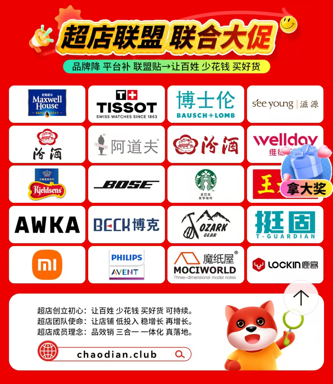 超店联盟王牌大促超多大牌自营官旗店铺精选爆款好货,活动形式丰富多样含直降、买赠、满减等权益(包含但不限于大幅折扣、双重权益和多重权益叠加)。在此基础上还能再叠加实物产品白拿免费送权益、白赚京豆权益、赢大奖等超店联盟官方补贴权益。