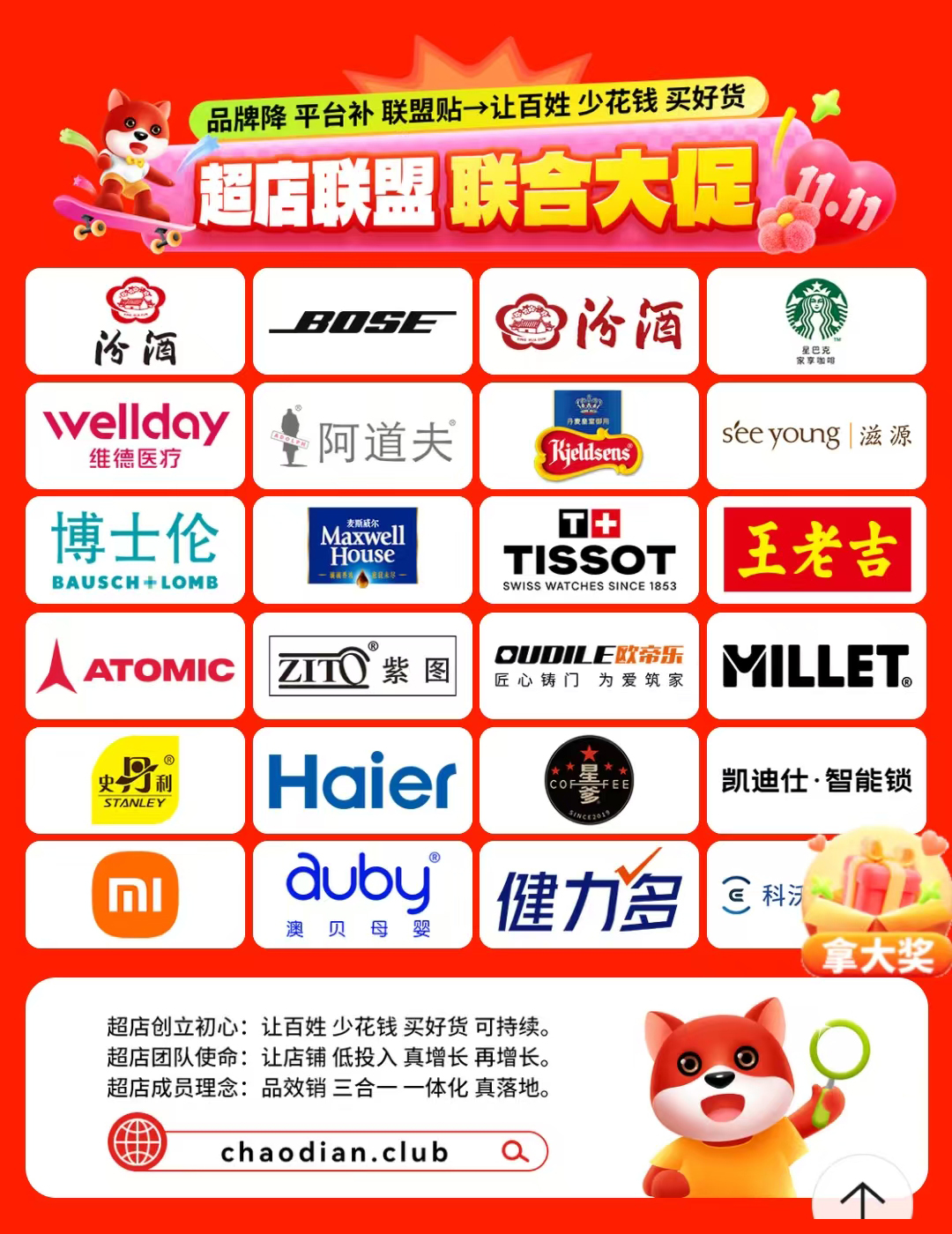 第八届超店联盟11.11大促6大独立闭环会场品类多品牌店铺爆款+丰富多样的玩法和高效互动跳转等优势,不止如此,还有如下品类头部品牌官旗店铺精选了全店优质好货的同时也为参加本届活动追加了超省活动方案,众多品牌携手超店联合活动目的只有一个:让百姓,少花钱,买好货 可持续。